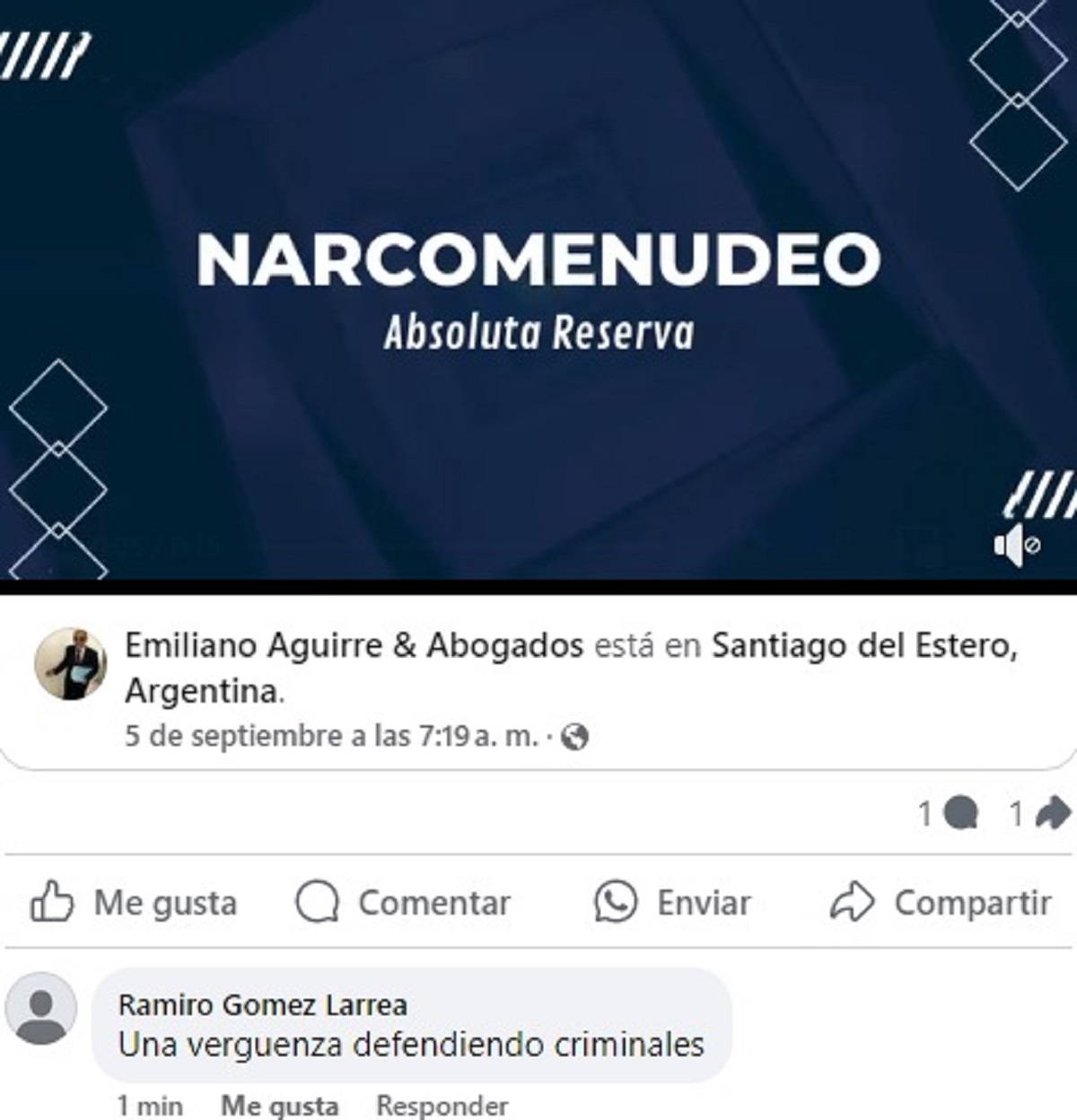 “Narcomenudeo. Absoluta reserva”, reza una publicidad en Facebook del estudio “Emiliano Aguirre y Abogados”. Esta publicación, al parecer, llamó la atención y causó indignación en uno de nuestros lectores, quien envió su queja a través del WhatsApp de Info del Estero (385 5781172).