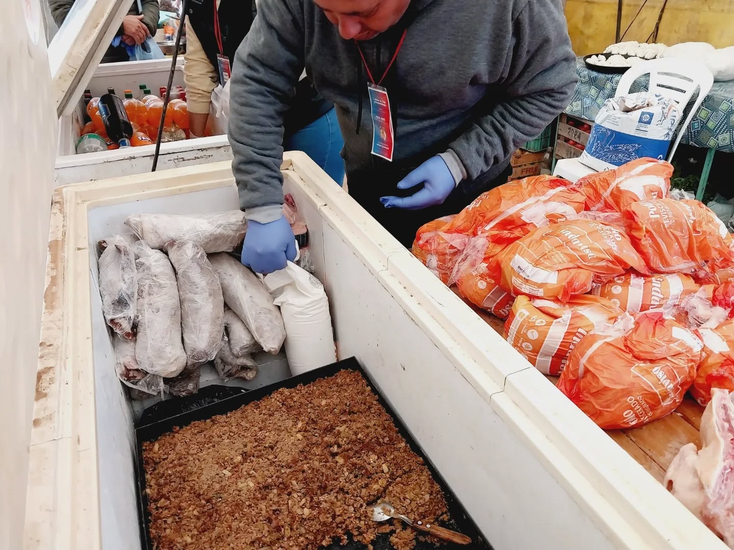 En ese contexto detectaron graves irregularidades en el puesto de un feriante tucumano quien tenía entre sus pertenencias milanesas y chorizos con ingredientes peligrosos para la salud.