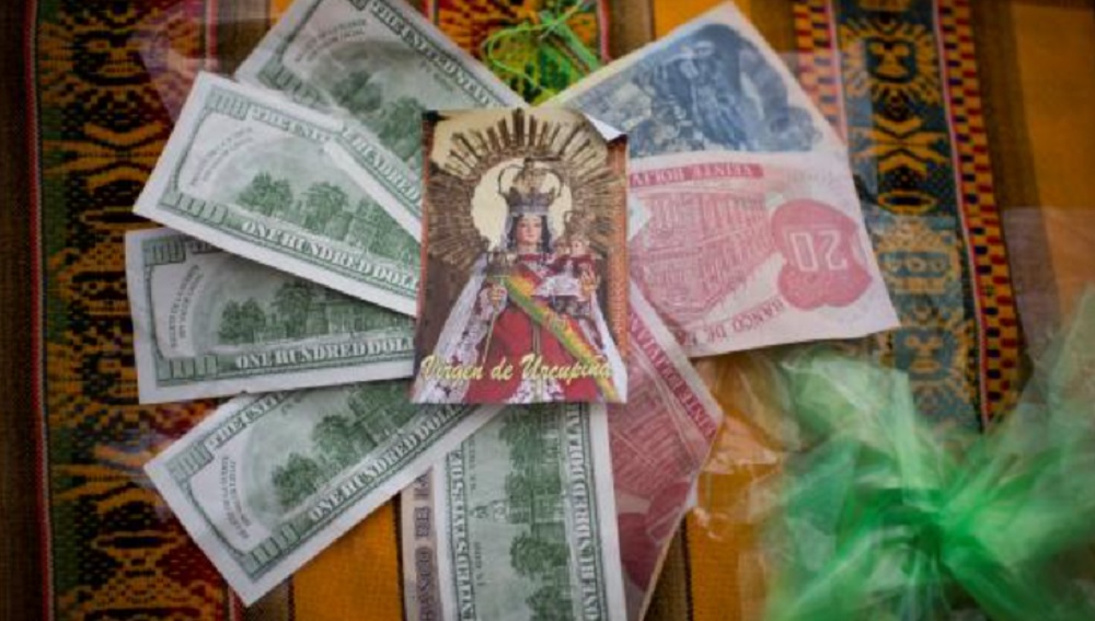 La tradición de colocarle billetes tiene que ver con el pedido de trabajo, buena cosecha, techo. Muchos además llevan sus vehículos para la “chaya de los autos” y así recibir la bendición, e incluso pedir para cambiarlo y regresar al año siguiente con el favor recibido.