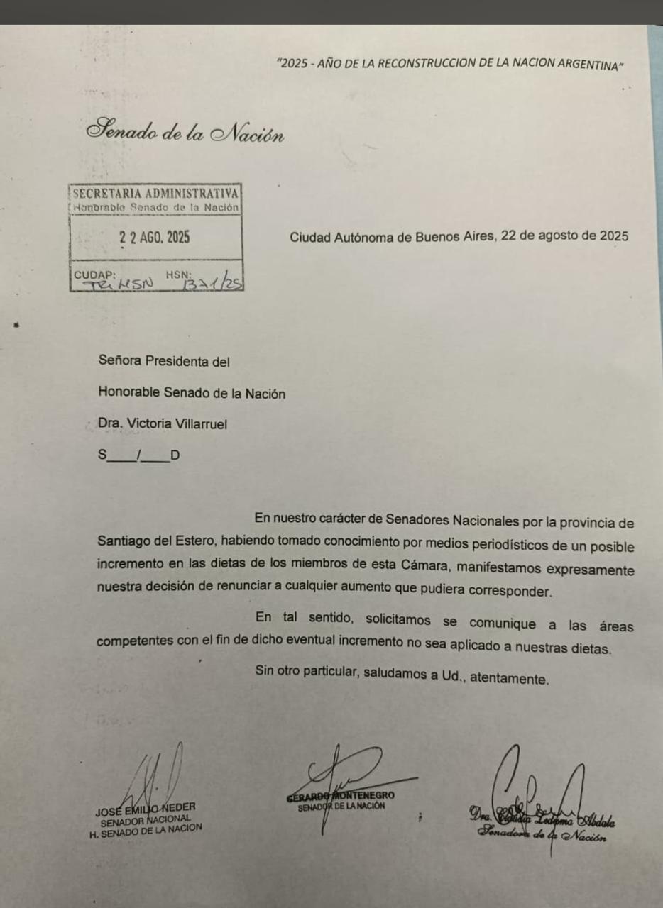 Los senadores santiagueños Claudia Ledesma Abdala, José Emilio Neder y Gerardo Montenegro enviaron una nota a la presidenta de la Cámara alta, Victoria Villarruel, en la que renuncian al supuesto y polémico incremento salarial para los legisladores.