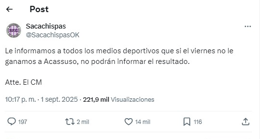 “Le informamos a todos los medios deportivos que si el viernes no le ganamos a Acassuso, no podrán informar el resultado. Atte. El CM”, fue la publicación de la institución de Villa Soldati en la plataforma digital.