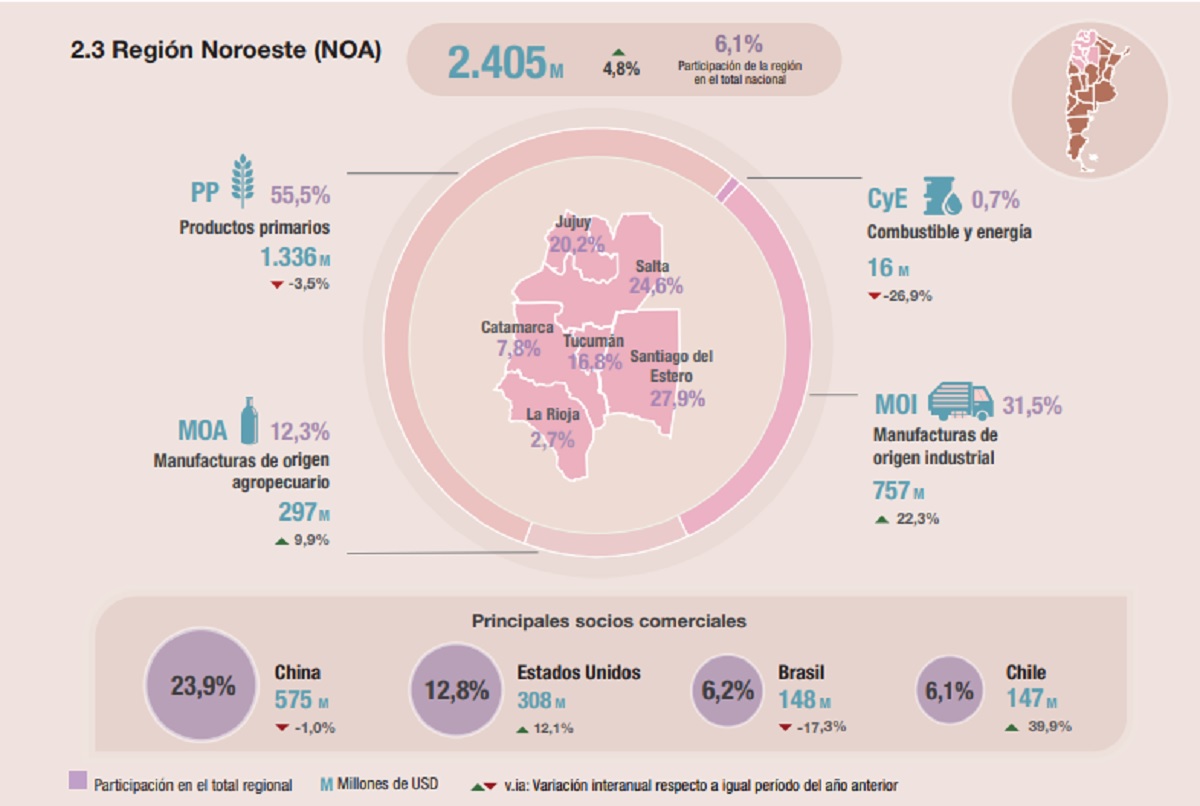 Las ventas al exterior, en orden descendente con respecto a la contribución regional, procedieron de Santiago del Estero, 27,9%; Salta, 24,6%; Jujuy, 20,2%; Tucumán, 16,8%; Catamarca, 7,8%; y La Rioja, 2,7%.