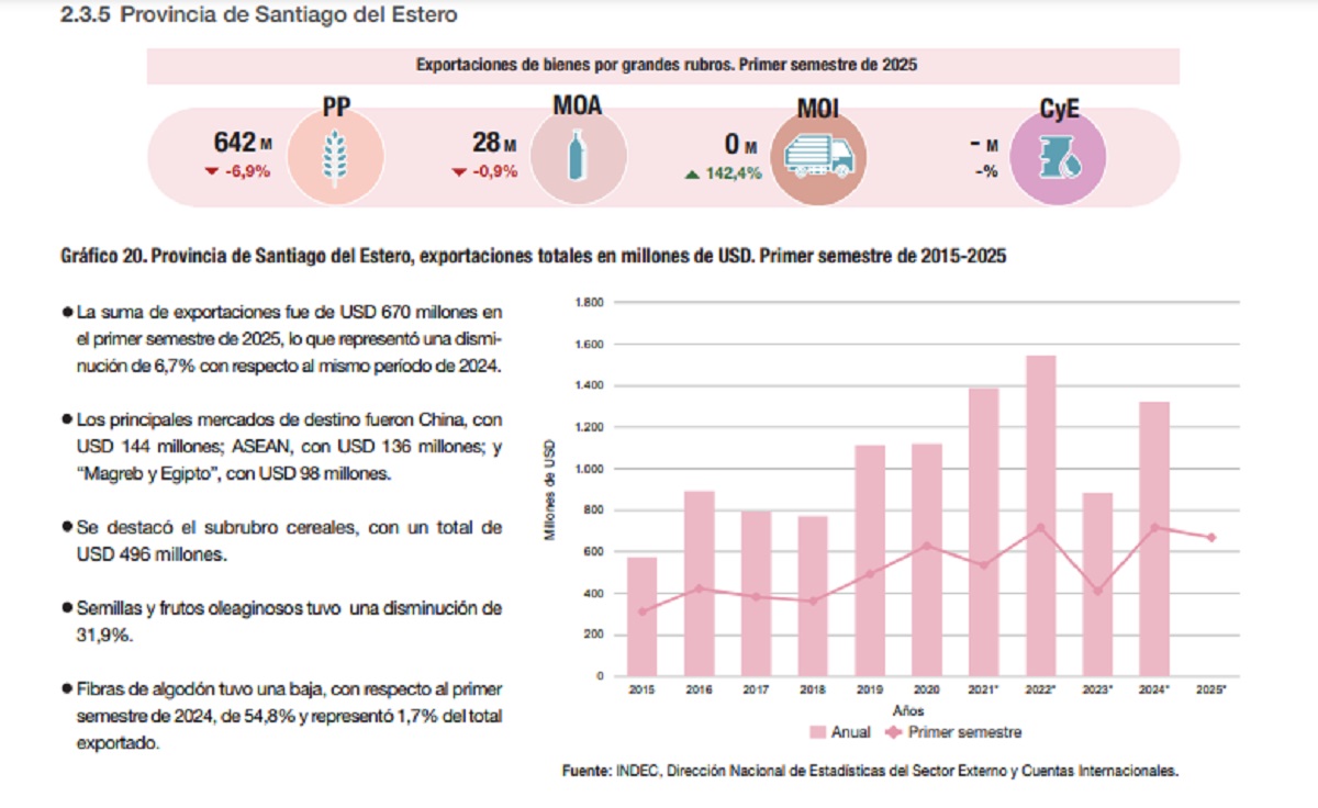 El último informe del Instituto Nacional de Estadísticas y Censos (INDEC) sobre exportaciones de bienes en el primer semestre de 2025 dejó un dato que marca un hito para el norte argentino: Santiago del Estero se consolidó como la provincia más exportadora de la región con el 1,7% de participación en el total nacional.