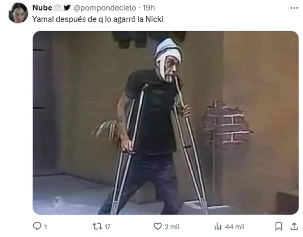 Frases como “La Nicki lo dejó seco” o “Se la pasa de perlas con mi amorcito Nicki Nicole. Por eso sos mi ídolo Lamine” se multiplicaron rápidamente, convirtiendo la lesión en un fenómeno viral de memes.