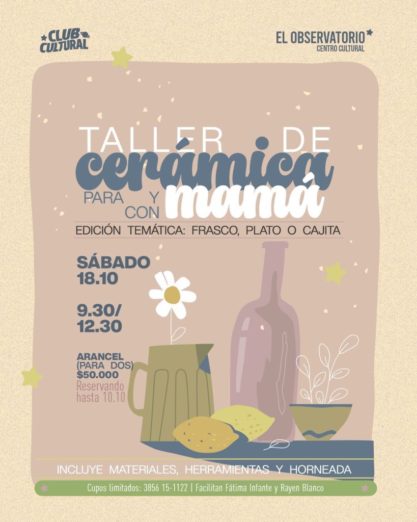 El próximo sábado 18 de octubre, el Observatorio Cultural dictará el Taller de Cerámica “Con y Para Mamá”, una propuesta pensada para celebrar esta fecha especial creando en conjunto. La actividad se desarrollará de 9:30 a 12:30 y tendrá como temática la elaboración de un frasco, un plato o una cajita decorativa.