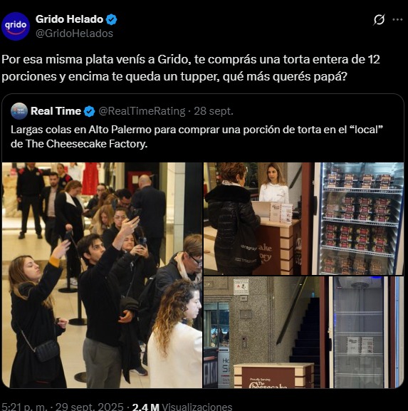 La cadena cordobesa de helados lanzó un picante posteo en X (ex Twitter): “Por esa misma plata venís a Grido, te comprás una torta entera de 12 porciones y todavía te queda un tupper, ¿qué más querés, papá?”.