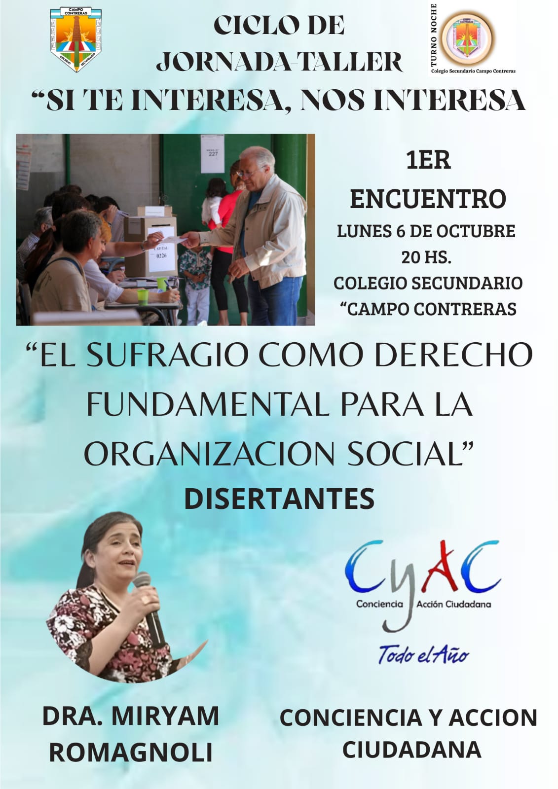 Este lunes 6 de octubre se llevará a cabo en el Colegio Secundario Campo Contreras el encuentro denominado “El sufragio como derecho fundamental para la organización social”. La disertación que tendrá como destinatarios a estudiantes del turno noche de la institución, iniciará a las 20.00, como parte del Ciclo de Jornada Taller “Si te interesa, nos interesa”.