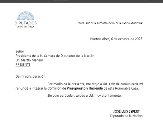 Este lunes José Luis Espert renunció a la Comisión de Presupuesto y Hacienda de la Cámara de Diputados a través de una carta presentada ante el presidente de la Cámara, Martín Menem.