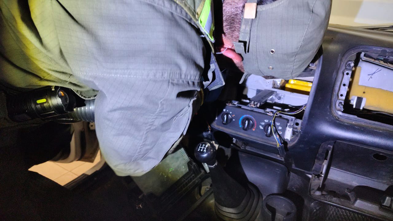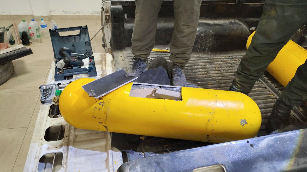 Durante la inspección de la cabina del vehículo, los uniformados observaron anomalías en los tornillos del estéreo y rastros de pintura fresca en las rendijas de la salida de aire, lo que despertó sospechas. Al continuar con la revisión, detectaron en la caja de carga dos tubos de GNC que presentaban incongruencias sonoras al golpearlos y soldaduras tipo “ventana” sobre su superficie longitudinal.