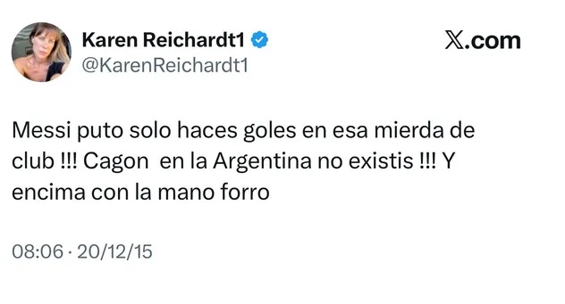 Luego de que Karen Reichardt quedara fija en la candidatura a diputada por La Libertad Avanza en la provincia de Buenos Aires, comenzaron a aparecer publicaciones antiguas en X (ex Twitter) en las que disparaba contra Lionel Messi. Al parecer, en 2015, el ícono sexy de los 90′ no estaba para nada conforme con el desempeño del mejor jugador del mundo.