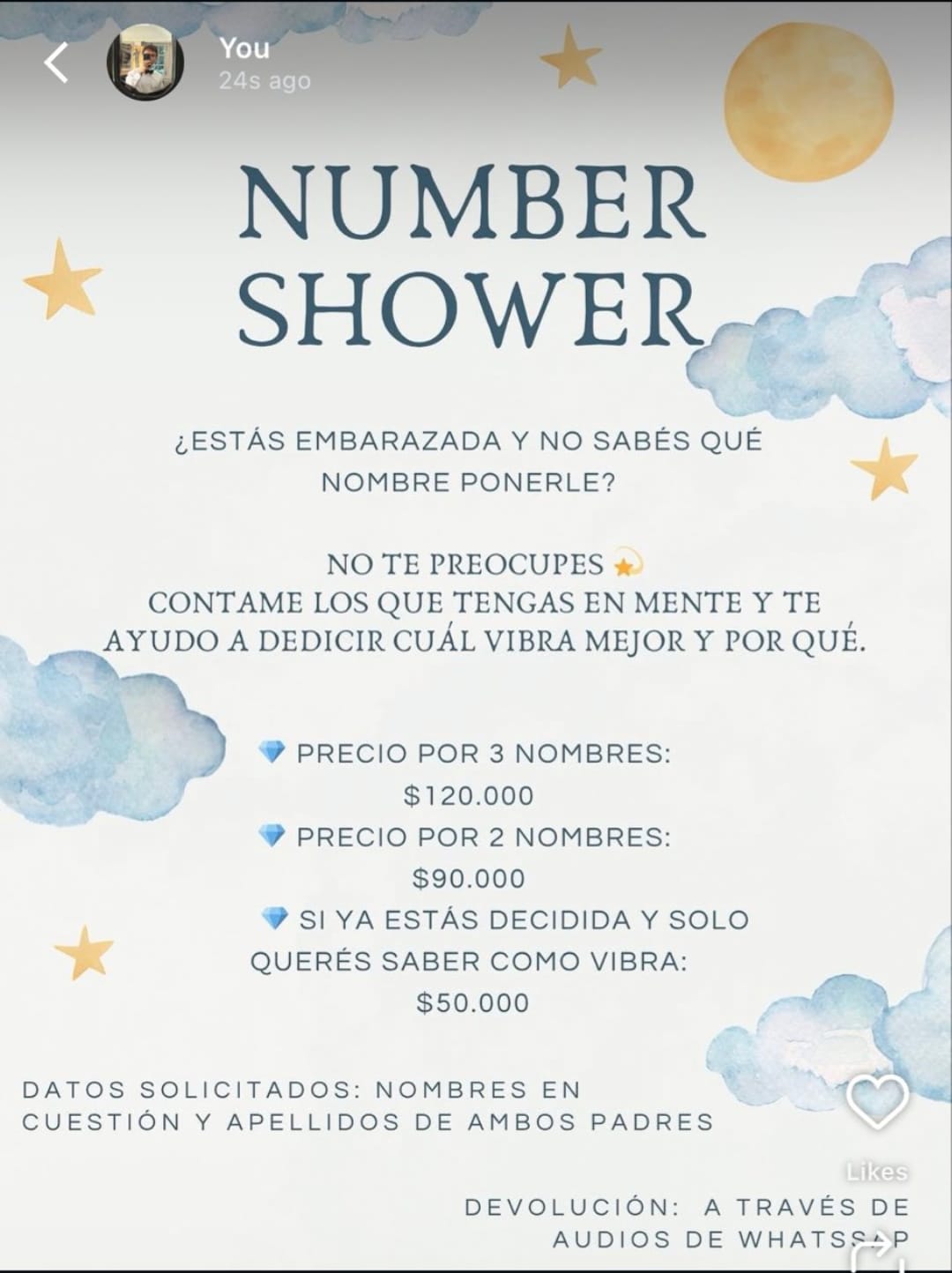 “Estás embarazada y no sabés qué nombre ponerle? No te preocupes. Contame los que tengas en mente y te ayudo a decidir cuál vibra mejor y por qué”, reza la publicidad. Seguidamente, detalla las tarifas por nombres.