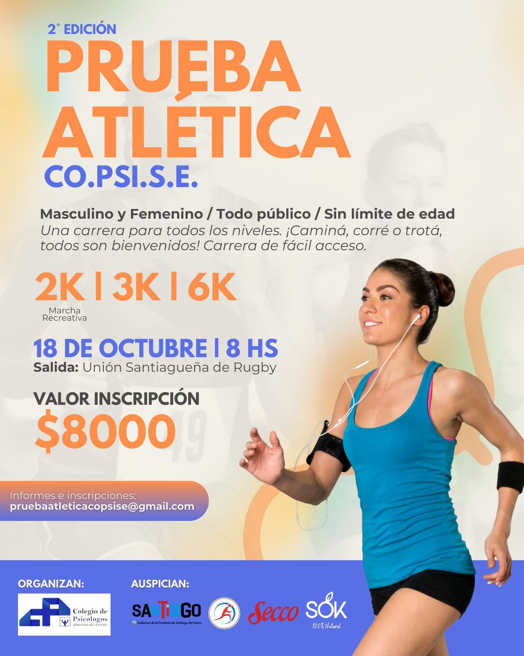 El Colegio de Psicólogos de Santiago del Estero invita a toda la comunidad provincial a ser parte de la segunda edición de la Prueba Atlética CO.PSI.S.E., evento que se llevará a cabo el próximo sábado 18 de octubre a las 8, en las instalaciones de la Unión Santiagueña de Rugby, de la capital provincial.