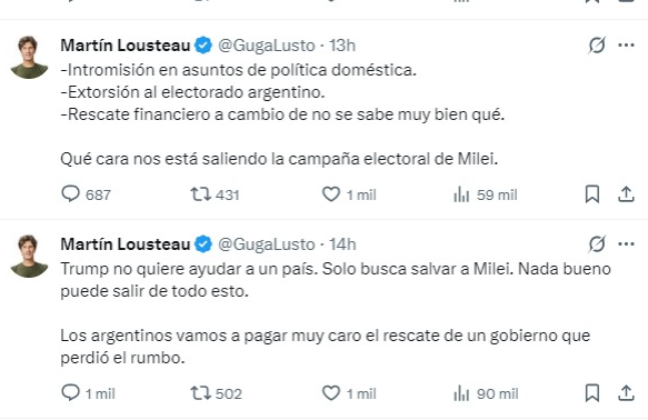 Más temprano, el economista había escrito en su cuenta de la red social X que lo manifestado por Trump denota una “intromisión en asuntos de política doméstica”, una “extorsión al electorado argentino”, y un “rescate financiero a cambio de no se sabe muy bien qué”.