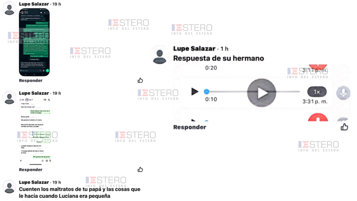 Según consta en la denuncia presentada por los querellantes a la que tuvo acceso INFO DEL ESTERO, desde un perfil de Facebook denominado “Lupe Salazar” se publicaron capturas de conversaciones privadas de la víctima, tanto con su madre como con uno de los imputados, Joaquín Pablo Cesca Castiglione, quien fue su pareja y la última persona que la vio con vida. Dichas conversaciones forman parte del expediente judicial y habían sido resguardadas por el Gabinete Forense del Ministerio Público Fiscal, lo que, según la presentación, demostraría una filtración interna de la evidencia.