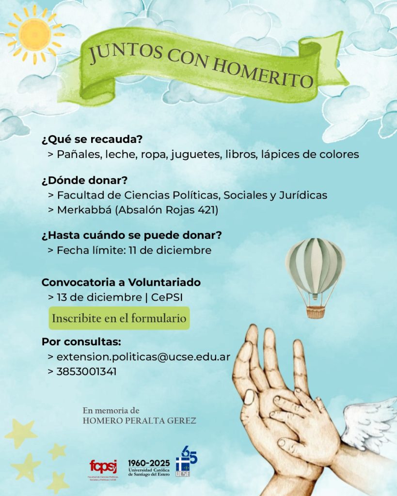 Hasta el 11 de diciembre, la comunidad puede sumarse donando pañales, leche, ropa, juguetes, libros y lápices de colores, que serán entregados a los pequeños pacientes del hospital. Las donaciones se reciben en la Facultad de Ciencias Políticas, Sociales y Jurídicas (UCSE) y en Merkabbá (Absalón Rojas 421).