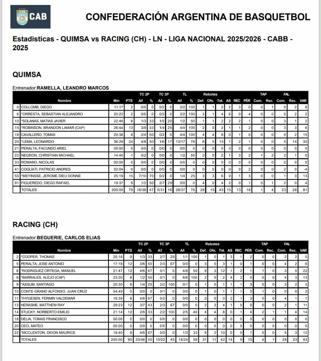 Manuel Rodriguez Ortega anotó 12 puntos y tomó 12 rebotes, también anotó 12 Emilio Stucky con dos tapas. Del lado perdedor, Leonardo Lema 24 tantos y 13 rebotes.