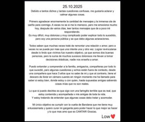 “Debido a tantos dichos y tantas situaciones confusas, me gustaría aclarar y calmar algunas cosas”, comenzó escribiendo la artista ante sus más de 230 mil seguidores. Luego, la artista continuó dirigiéndose hacia sus fans y expresando su cariño por los mensajes recibidos: “Primero agradecer enormemente la cantidad de mensajes y la inmensa ola de cariño para conmigo. A veces no sé si me lo merezco, pero me emociona mucho hoy, después de varios días, leer tantos mensajes que de a poco iré respondiendo. Es muy difícil, muy doloroso y muy complicado poder explicar todo lo sucedido, pero soy una persona pública y sé que debo algunas aclaraciones”.