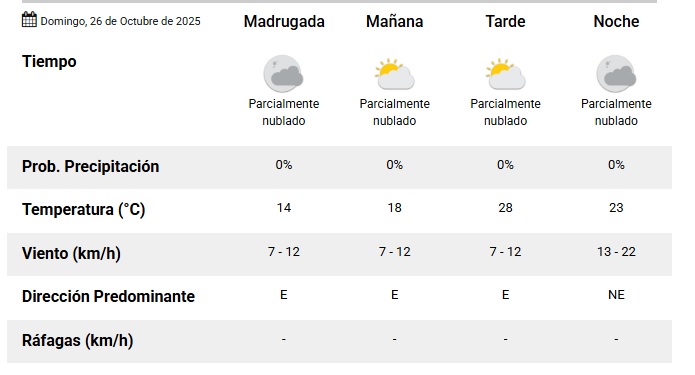 Para el domingo 26 de octubre, día de elecciones, se anticipa una jornada estable y templada, con máxima de 28°C. El cielo permanecerá parcialmente nublado durante la madrugada, mañana, tarde y noche, sin probabilidades de lluvias, lo que favorecerá el desarrollo normal del acto electoral en toda la provincia.