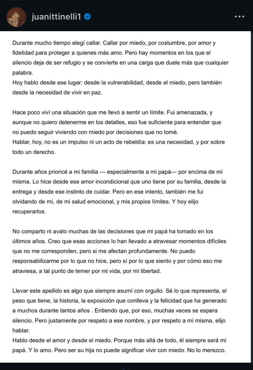 En otra parte del comunicado, Juana Tinelli reconoció que no comparte algunas de las decisiones que su padre tomó en los últimos años: “Durante años prioricé a mi familia, especialmente a mi papá, por encima de mí misma. Pero en ese intento me fui olvidando de mi salud emocional. No comparto ni avalo muchas de las decisiones que mi papá ha tomado en los últimos años. No puedo responsabilizarme por lo que no hice, pero sí por lo que siento y por cómo eso me atraviesa”.