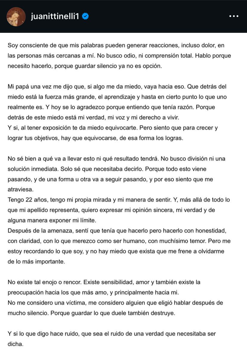 Juana también reflexionó sobre lo que implica llevar el apellido Tinelli y la exposición que eso conlleva: “Llevar este apellido es algo que siempre asumí con orgullo. Sé lo que representa, el peso que tiene, la historia y la exposición que conlleva. Pero justamente por respeto a ese nombre, y por respeto a mí misma, elijo hablar”.