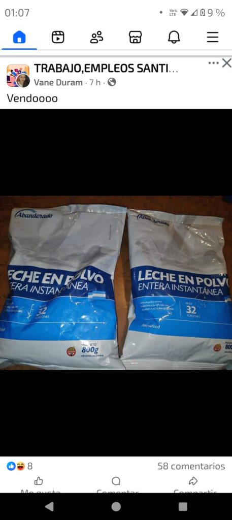 La denuncia llegó acompañada de capturas de pantalla que muestran publicaciones de usuarios que, sin ningún pudor, ofrecen leche chocolatada, leche en polvo, galletitas y otros productos —todos con la leyenda impresa en el envase “PROHIBIDA SU VENTA”— a precios muy bajos, aprovechando la necesidad de las familias.