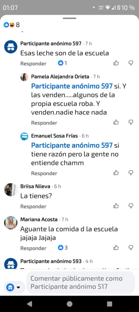 “Buenas noches, disculpe la hora. Pero ya estamos cansados de que la gente de la UPA y de las escuelas vendan los alimentos que son gratis para los chicos. Yo, sin poder conseguir alimentos en la UPA, tengo que andar comprándole a la gente sabiendo que eso dan gratis. Indignada estoy de que nadie tome medidas sobre eso”, expresó una vecina en su mensaje a Info del Estero.