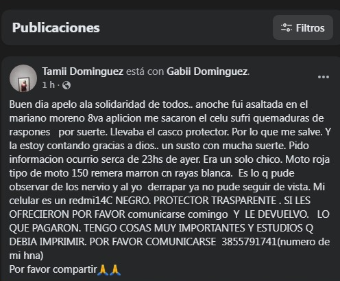 Una joven apellido Rodríguez, a través de sus redes sociales contó la terrible noche que pasó este martes pasado en el barrio Mariano Moreno, zona sur de ciudad Capital, donde sufrió un violento ataque por parte de un motochorro, quien no solo le robó sino que también provocó su derrape.