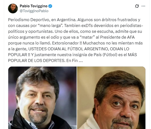 Este posteo se suma a una larga lista de publicaciones en la red social X (anteriormente llamada Twitter), en las que Toviggino convive con el conflicto hacia todos los críticos de la actual dirigencia de AFA. El dirigente, volvió a redactar un tweet para defender la gestión de Claudio Tapia, esta vez peleándose con Ricardo Caruso Lombardi.