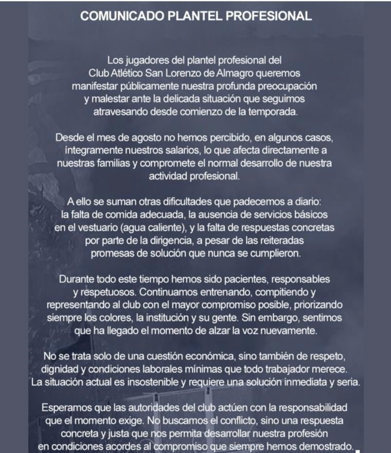Horas críticas se viven en San Lorenzo de Almagro. El plantel profesional rompió el silencio y emitió un duro comunicado contra la dirigencia, denunciando una serie de situaciones que, según explican, vuelven “insostenible” el día a día en el club.