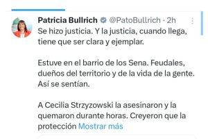 La ministra de Seguridad, Patricia Bullrich, celebró hoy la condena a César Sena como autor material del femicidio de Cecilia Strzyzowski, y el fallo que consideró responsables a Emerenciano Sena y Marcela Acuña como partícipes necesarios del crimen.
