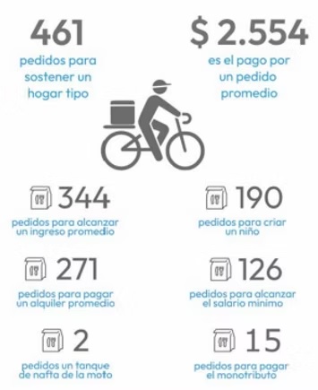 El estudio también detalla que un trabajador requiere 344 pedidos para igualar el ingreso promedio individual del país, mientras que una persona sola, sin alquiler, necesita 149 pedidos para no caer bajo la línea de pobreza. En el caso de la canasta alimentaria individual, el umbral baja a 67 pedidos.