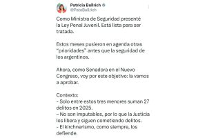 “Como senadora, en el nuevo Congreso, voy por este objetivo: la vamos a aprobar”, sentenció Bullrich, quien aportó contexto a su nuevo impulso a la medida con el caso de tres menores de José C. Paz y San Miguel que, entre todos, suman “27 delitos en 2025”.