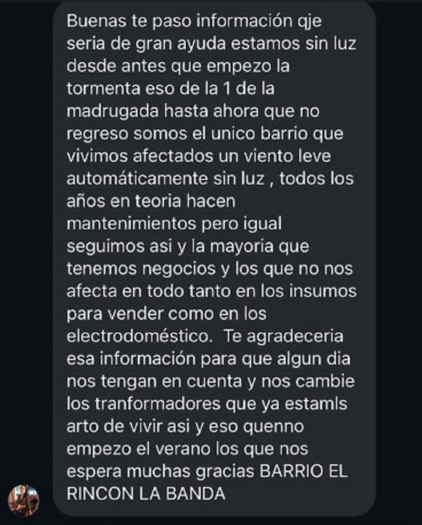 Reclamos: el B° El Rincón de La Banda lleva más de 12 horas sin luz y hay preocupación