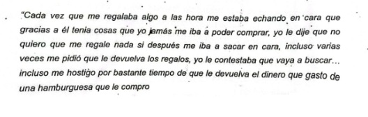 M.E.S. dejó constancia en su denuncia que el 9 de noviembre pasado le escribió para que este médico fuera a su casa a llevarse unas bebidas saludables, que esta persona le reclamaba y que C.E.F. se presentó con otra mujer: “una vez ahí empezó a reclamarme regalos que me había hecho, las bebidas saludables, el dinero del viaje a Colombia que siempre quedó claro que fue una invitación de él. Se metía en la casa, miraba para adentro y me enumeraba los regalos que me había hecho, reclamándolos”.