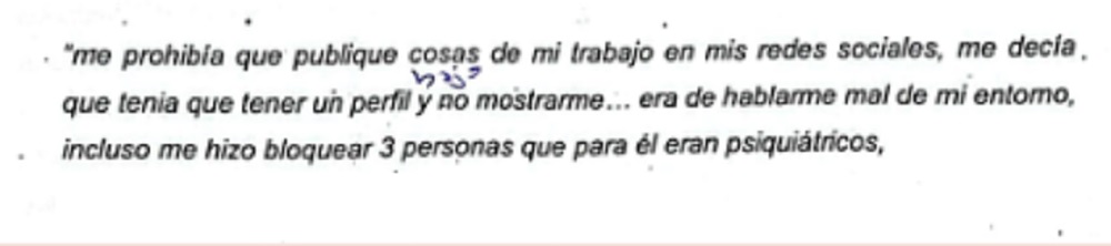 Siempre según el testimonio ante la justicia de M.E.S. “empecé a ponerme mal, le dije a la mujer que lo acompañaba si no le daba vergüenza y ella me dijo ‘no te puedes poner pelotuda por un tipo’ y yo le dije que siento vergüenza de haber estado con un miserable”. Desde ese día la denunciante lo bloqueó de todos lados y empezó a sufrir episodios de ataques de pánico y “siento vergüenza por mí misma, por no haberme dado cuenta, por haber estado con alguien así y hay días en los que me duele la cabeza, tengo pensamientos muy feos, miedo a que él me mande a hacer algo, me duele el estómago y no como ni duermo bien”.