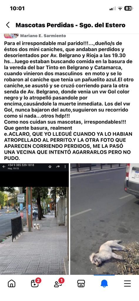 La polémica comenzó cuando un vecino compartió en el grupo “Mascotas Perdidas – Sgo. del Estero” imágenes de los dos caniches caminando por avenida Belgrano y luego la foto de uno de ellos atropellado. En su relato, responsabilizó directamente a los dueños por un presunto descuido que habría derivado en que los animales escaparan, fueran robados y terminaran en la calle en estado de confusión.
