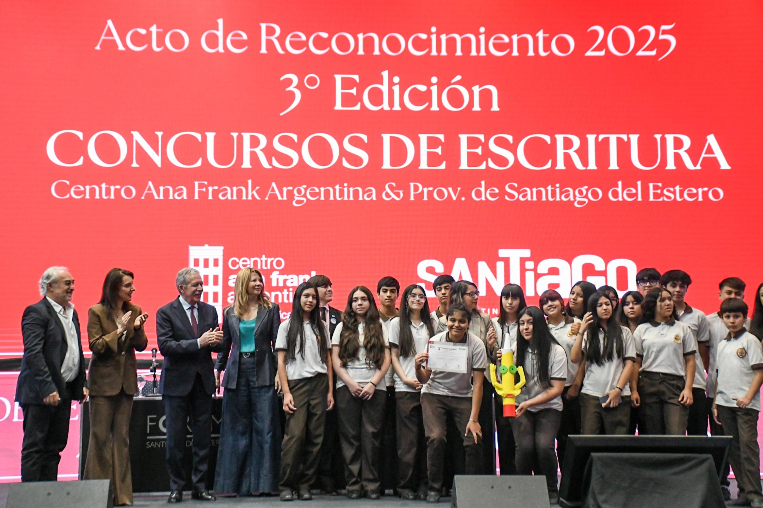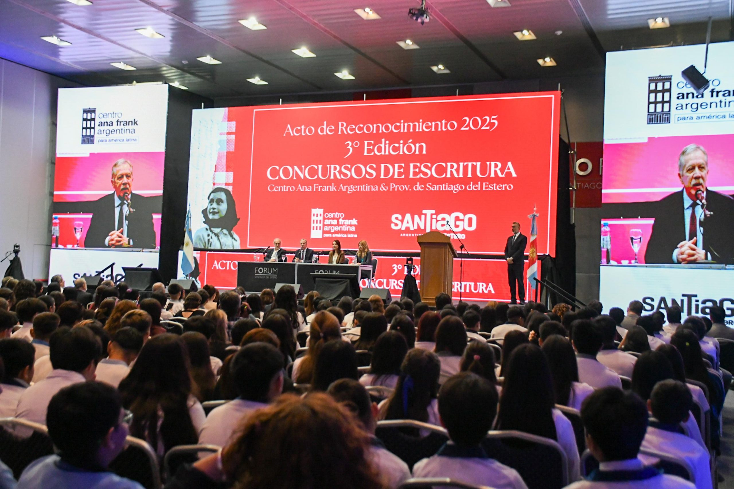 Con la presencia de gran cantidad de estudiantes y docentes de establecimientos educativos de distintos puntos de la provincia, se realizó este martes en el Centro de Convenciones Fórum la entrega de premios del 3° Concurso de Escritura “De Ana Frank a Nuestros Días”, con la presencia del jefe de Gabinete y gobernador electo, Elías Suárez, quien anunció la cuarta edición de este evento para el año 2026.