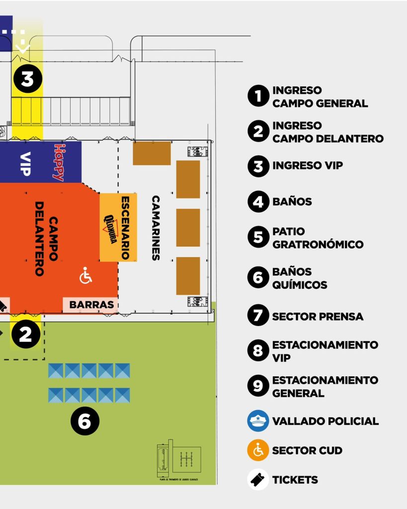 Según se informó, el predio contará con accesos diferenciados para VIP, campo delantero y campo general, con el objetivo de ordenar el ingreso y agilizar la circulación de asistentes. Además, se confirmó que la prensa tendrá un espacio exclusivo, equipado con wifi y una carpa destinada a garantizar el trabajo periodístico en condiciones adecuadas.