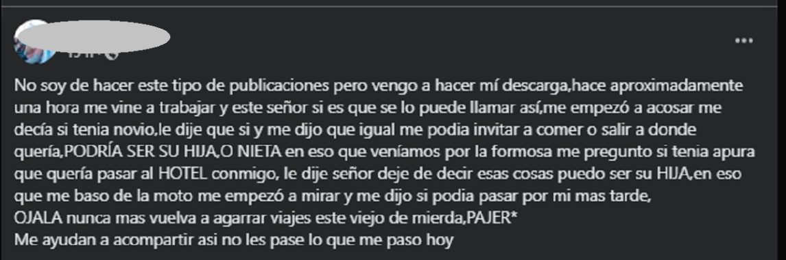 “Ojalá nunca más vuelva a agarrar viajes este viejo de mierda, paj***”, escribió la jovencita para alertar a otros sobre el peligro que ir con este señor.