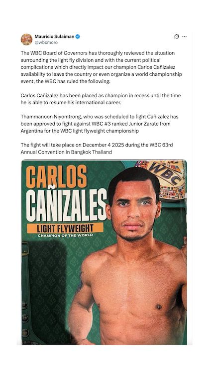 “Carlos Cañizales ha sido puesto como campeón en receso hasta que pueda retomar su carrera internacional”, señaló Sulaimán, dejando el cinturón vacante para que Zárate y Niyomtrong definan al nuevo monarca minimosca.