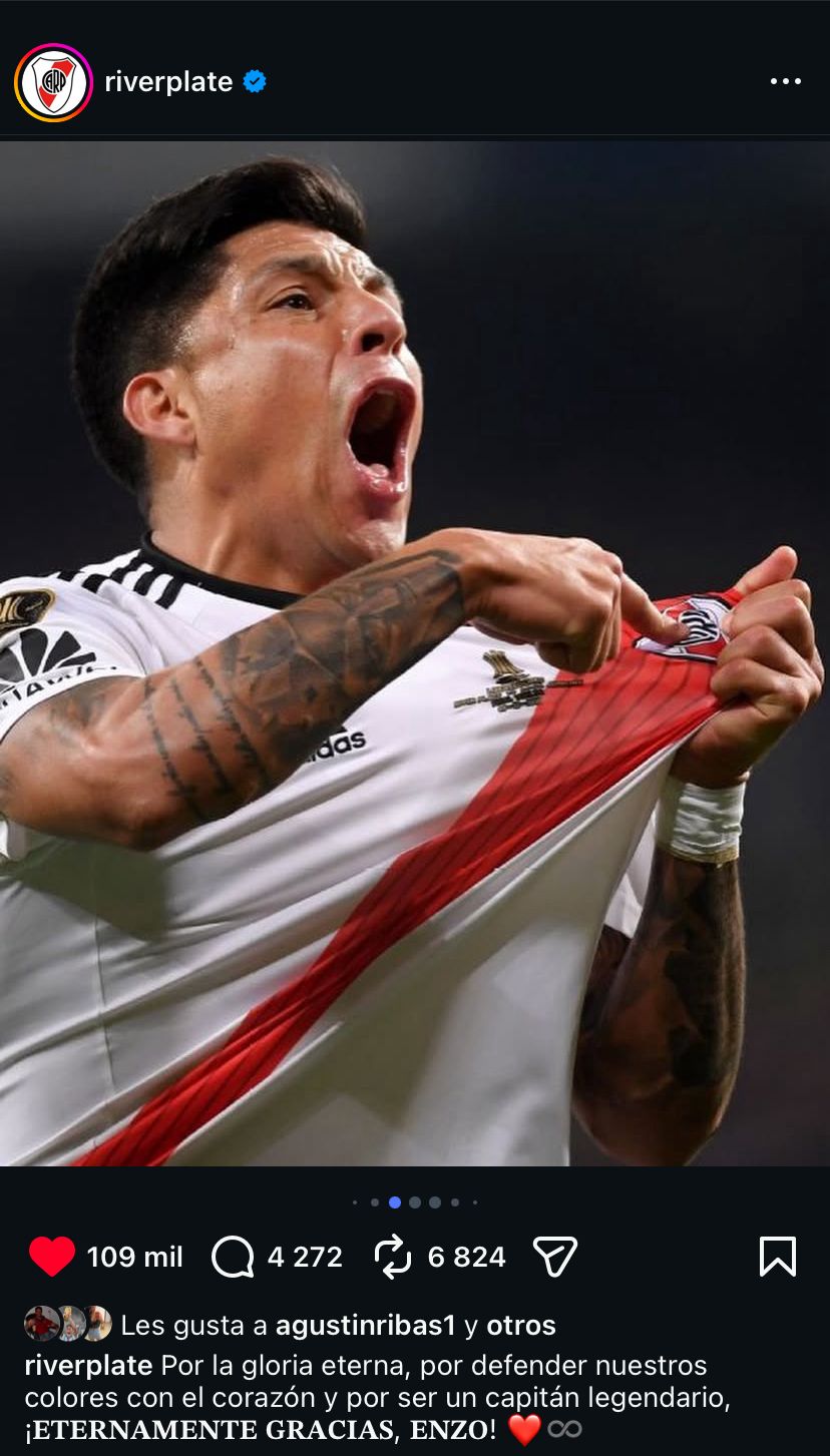 “Por la gloria eterna, por defender nuestros colores con el corazón y por ser un capitán legendario, ¡eternamente gracias, Enzo!”, fue la frase elegida para sintetizar el cariño y la admiración que Pérez se ganó durante su etapa en el club. El mensaje fue acompañado por emojis de corazón y el símbolo de infinito, reforzando la idea de que su legado permanecerá para siempre en la memoria del hincha.