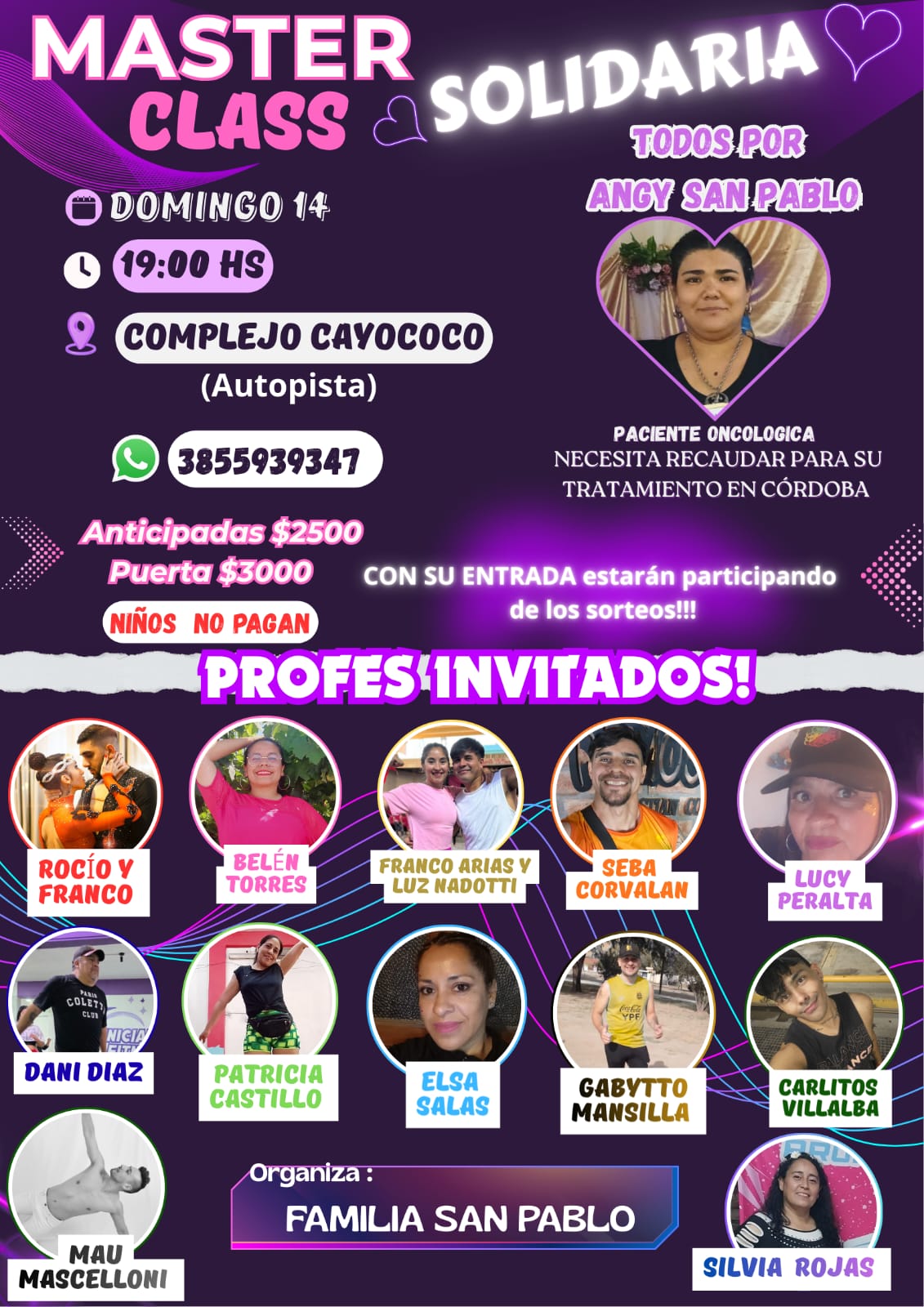La comunidad vuelve a unirse para acompañar a Ángela San Pablo, la vecina que atraviesa una dura enfermedad y debe afrontar un complejo tratamiento oncológico en Córdoba y que recientemente apeló a la solidaridad para poder continuar con las sesiones y estudios médicos indispensables para su salud. Tras la difusión de su situación, familiares, amigos y profesores de distintas disciplinas decidieron organizar una Master Class Solidaria, cuya recaudación será destinada íntegramente a colaborar con sus gastos médicos.