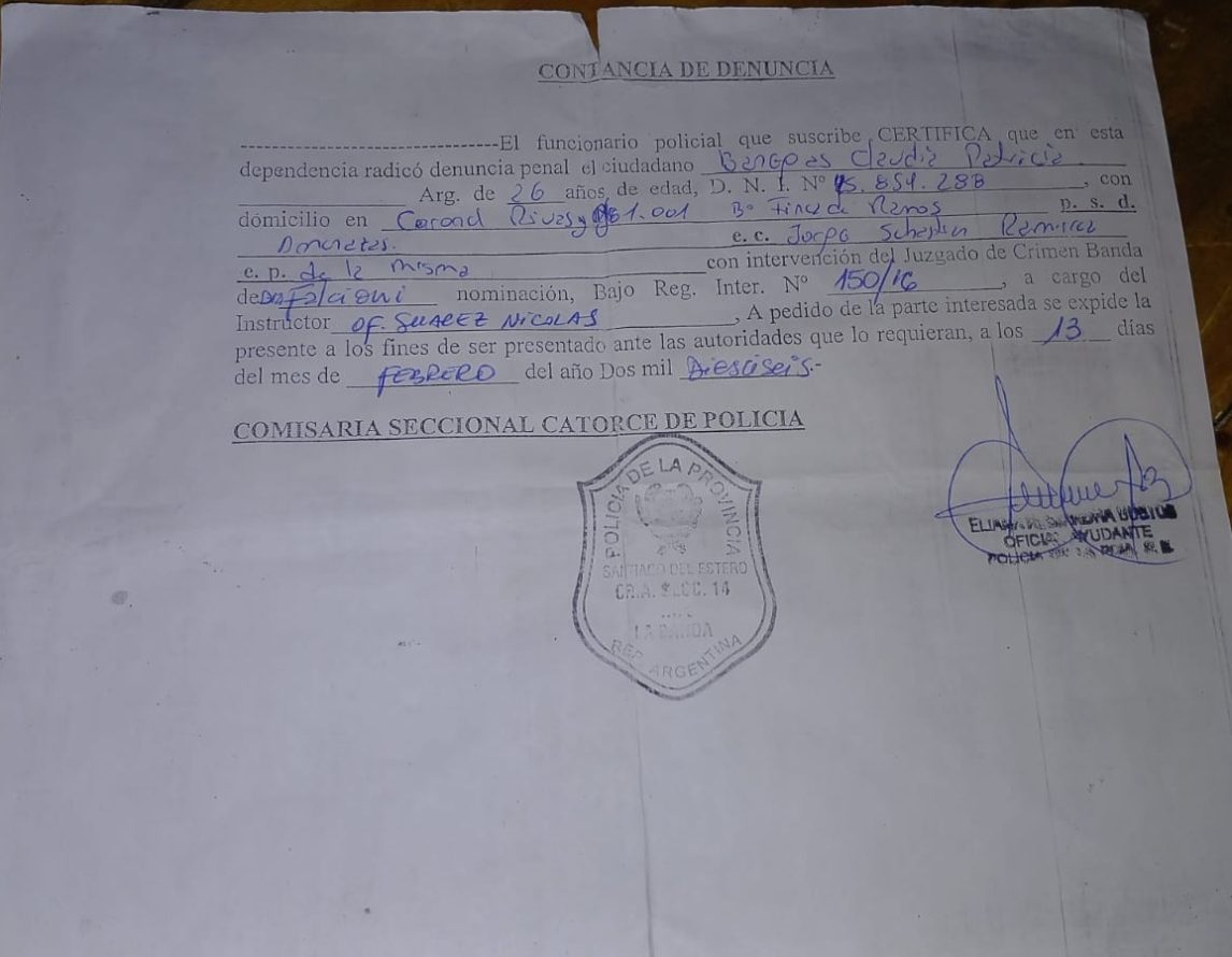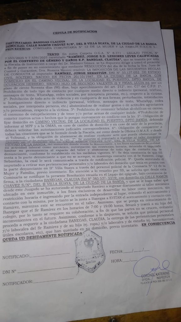 Harta de estas situaciones, Claudia apela a que la justicia se pronuncie para recuperar a su hija y vivir “en paz” en su casa. Recientemente interpuso “una acción de protección contra la violencia familiar a fines de octubre en el Juzgado de Familia de La Banda, a cargo de la Dra. Natalia Susana Taboada”. Si bien, se dictaron medidas, Ramírez no puede ser notificado hasta la fecha, “ya que la jueza no firma el oficio”, y tampoco tuvo audiencia con la damnificada, por lo que acusa una “mora judicial”.