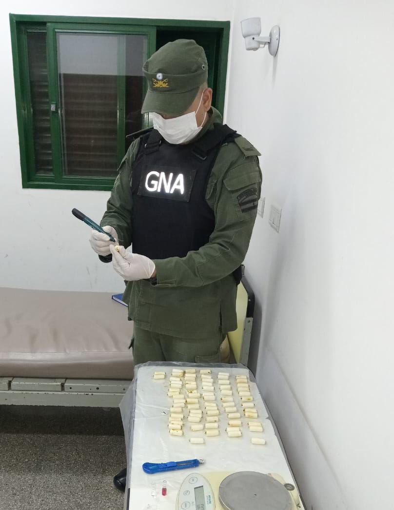 Ante esa situación, el ciudadano fue derivado al Nosocomio local en el que mediante placas radiográficas se pudo constatar que poseía cápsulas en su cuerpo. Luego, el involucrado expulsó 84 cápsulas que sumando las que llevaba en su campera son un total de 113 cápsulas que sometidas a la prueba de campo Narcotest arrojaron resultado positivo para cocaína con un peso total de 733 gramos.