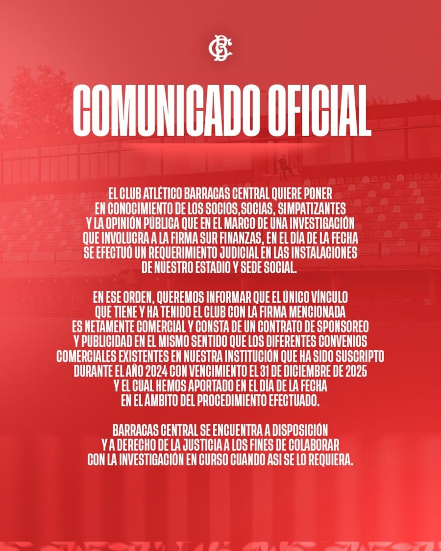 Barracas Central difundió este martes un comunicado oficial luego de que su estadio y su sede social fueran allanados en el marco de una investigación judicial contra la empresa Sur Finanzas. El club buscó llevar tranquilidad a sus socios y simpatizantes, y explicó públicamente cuál es el vínculo que mantiene con la firma involucrada en la causa.