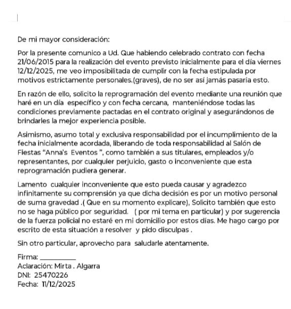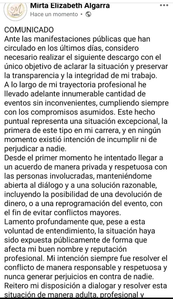 “Me dedico hace 10 años a esto, hice más de 3 mil eventos y nunca tuve que reprogramar. Mi trayectoria es impecable”, concluyó, señalando que su abogado es el Dr. Gustavo Peralta y que espera poder resolver el conflicto sin más agresiones.