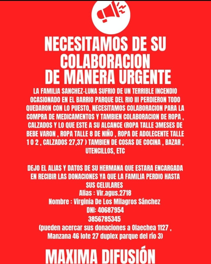 El alias para hacer transferencias es vir.agus.2718, perteneciente a Virginia de los Milagros Sánchez (DNI  40687954), hermana de la mujer damnificada. Pues, según indicaron, ni ella ni su pareja tienen celulares, ya que fueron consumidos en el incendio. También pueden contactarse al 3856785345 o acercar sus donaciones a Olaechea 1127, manzana 46, lote 27, dúplex, Parque del Río 3.