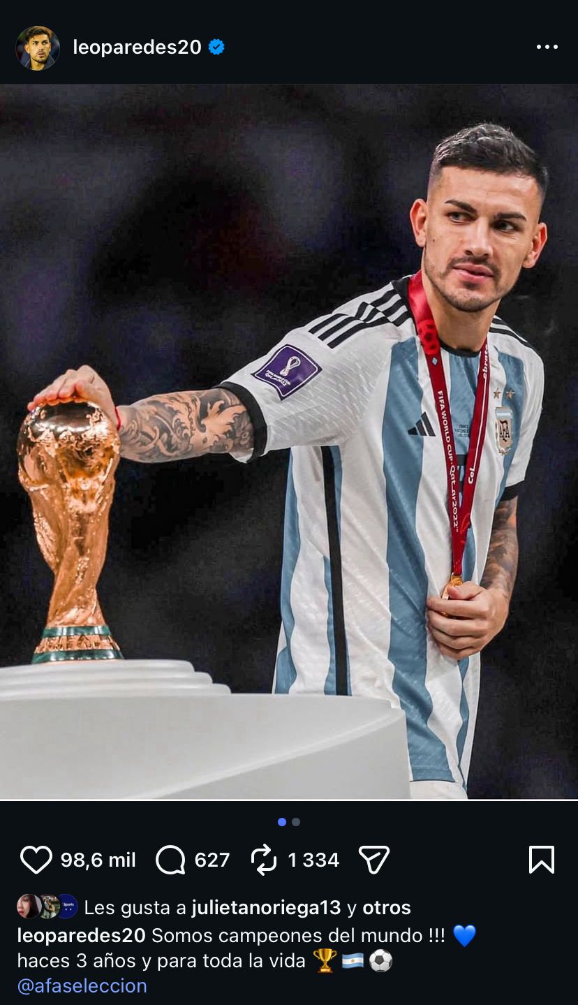 Al cumplirse tres años de la consagración de la Selección Argentina en el Mundial de Qatar 2022, los recuerdos y las emociones vuelven a estar a flor de piel. En ese marco, Leandro Paredes utilizó sus redes sociales para compartir un mensaje cargado de sentimiento y orgullo.
