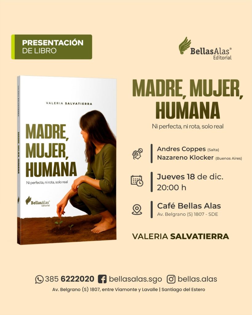 La escritora bandeña, Valeria Salvatierra presentará su primer libro, “Madre, Mujer, Humana. Ni perfecta, ni rota, solo real”, el jueves 18 de diciembre a las 20:00 horas, en Bellas Alas, ubicado en Av. Belgrano Sur 1087, ciudad de Santiago del Estero.