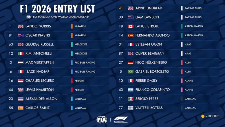 En cuanto a los equipos, Sauber figura oficialmente un año más, pese a encontrarse en plena transición hacia Audi. El cambio legal aún no se completó, aunque en pista la escudería competirá bajo una nueva identidad comercial asociada a su patrocinador principal.